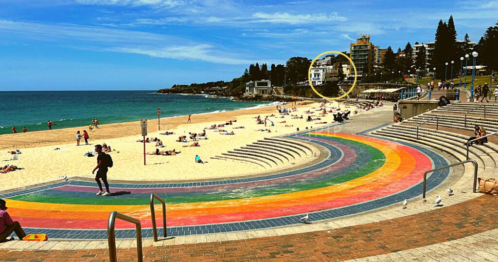 可愛い虹色のペイントがされたクージービーチの中央部分。昼になるとこちらの階段でお昼ご飯を食べる人で賑わいます。近くでテイクアウトしたサンドイッチでビーチを眺めながら一息つくのも贅沢な時間ですね。