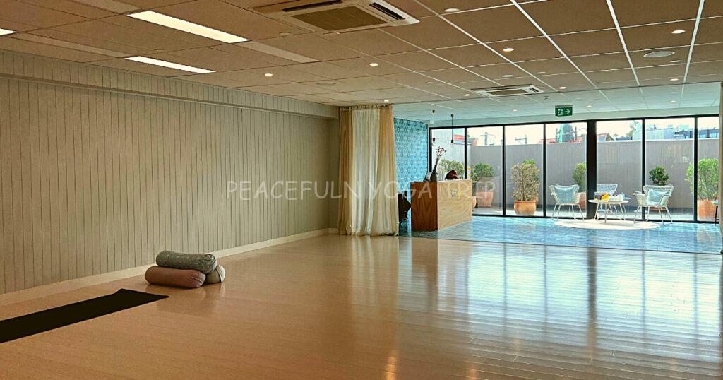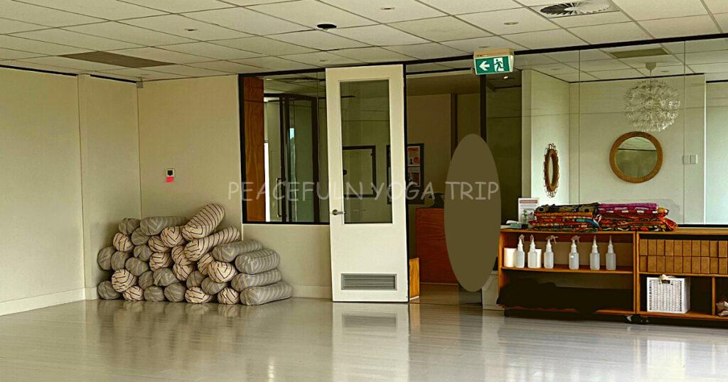 店内はすでに生徒さんが来店しており店内の様子は撮影ができませんでしたが、他の2店舗と同様の広さのヨガスタジオ、お洒落で素敵なフロントがあるシンプルなヨガスタジオでした。