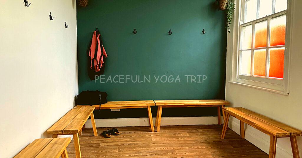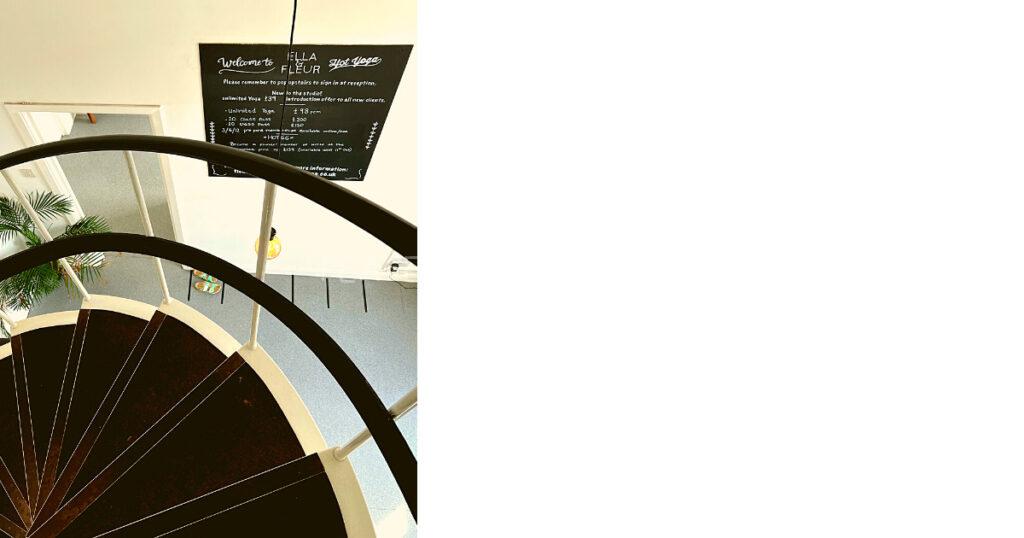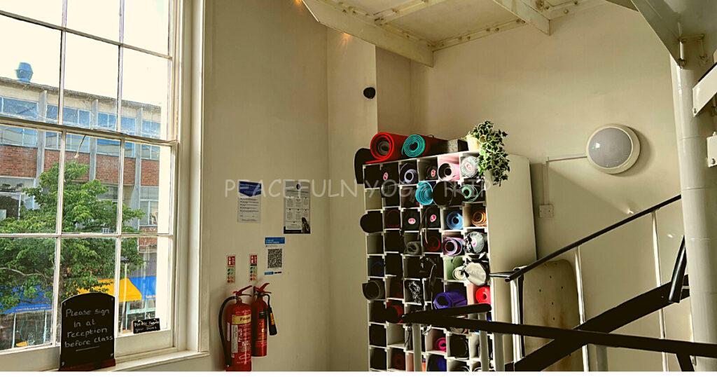 螺旋階段を上ると2階に(イギリス式では1階)ヨガラック、靴を置く場所があります。