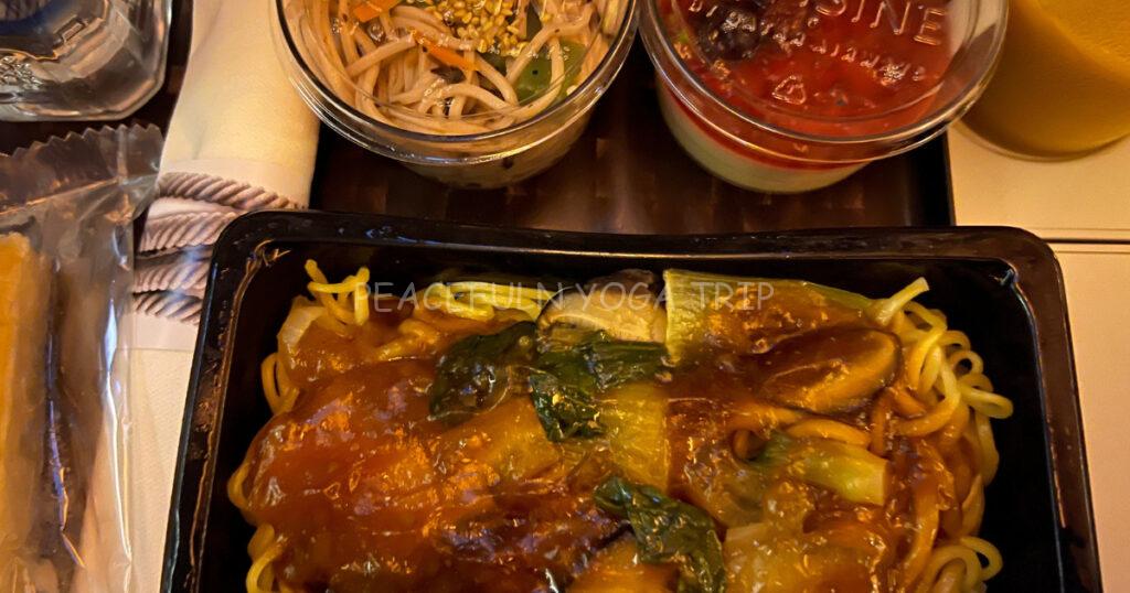 エコノミーの食事ですが、ベジタリアンとビーフの選択ができて、ベジタリアンの焼きそばを選択し美味しくいただきました。