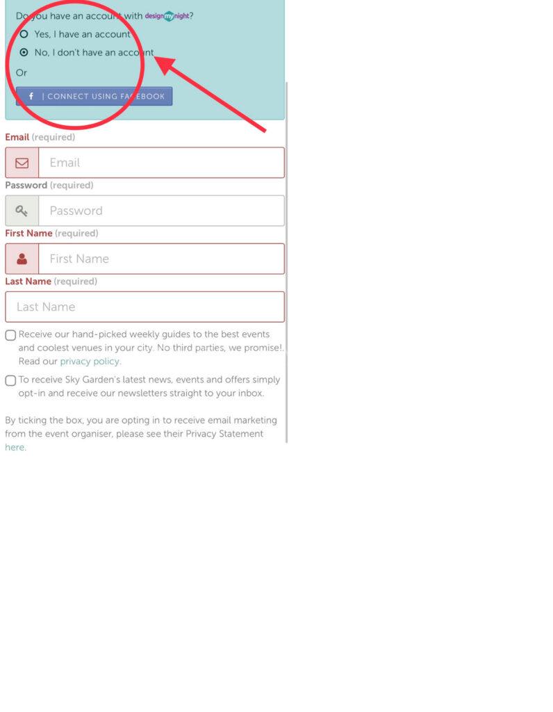 アカウント登録の為、アカウントを持っておらず作成する方は「No,I don’t have an account」をクリックしてEmail、password、First name、Last nameを入力しイベント情報などが欲しい場合は下方にある2箇所へレ点を入れる