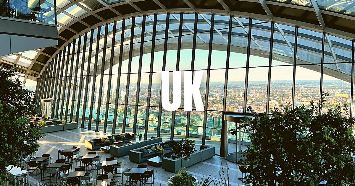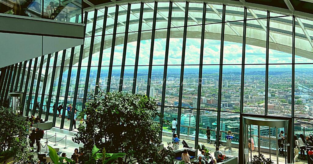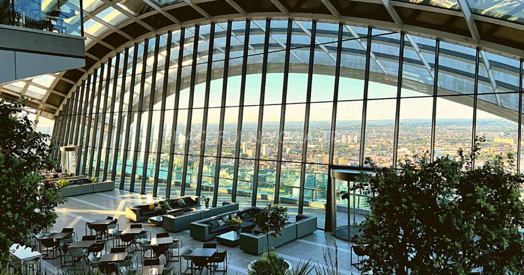 ロンドン中心部にあるスカイガーデンは、高さ155mに公共のガーデン、レンストラン、バーがありロンドン市内を一望できる開放的な場所です。エレベーターで35階へ行き、さらに階段で36階まで行くことができます。